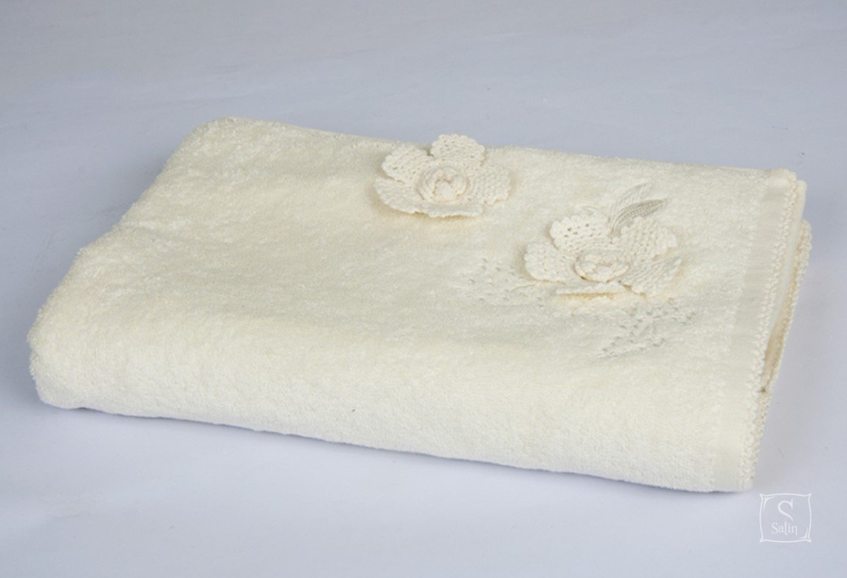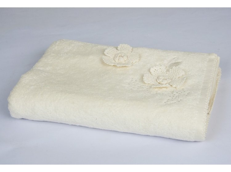 Махровий рушник Talia від турецької торгової марки Romeo Soft виконаний у молочному кольорі з бавовняної махри (100% бавовна) високої щільності ( 500 г/м² ), прикрашений об'ємною вишивкою у вигляді квітів.