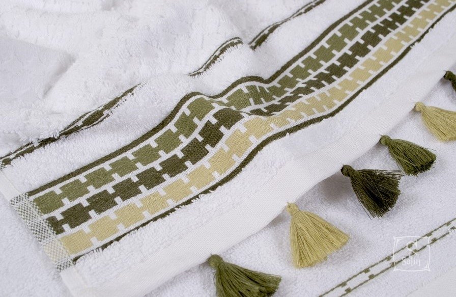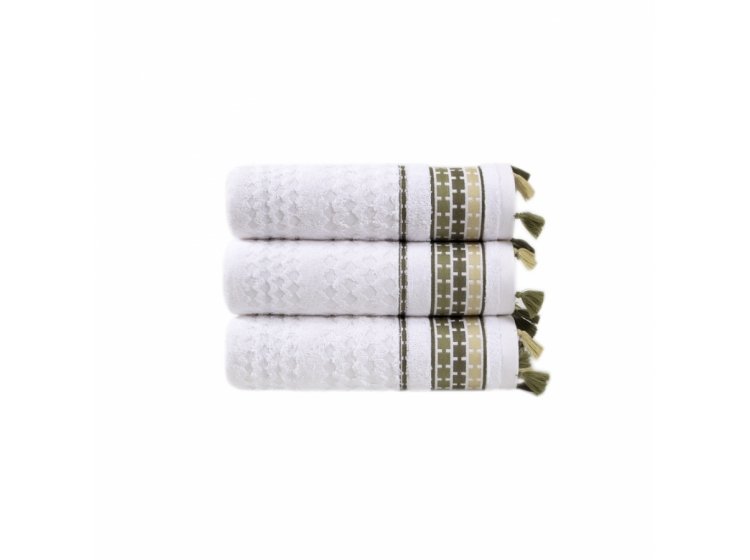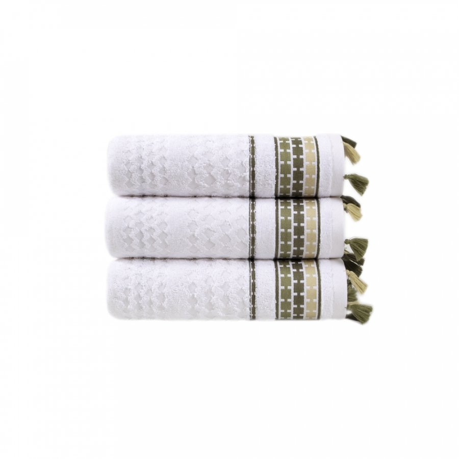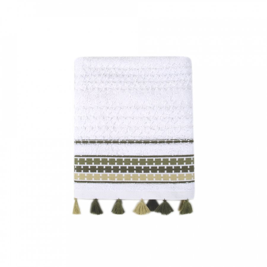Махровий рушник Irya Jakarli Coplin yesil виконаний у білому кольорі з 93% бавовни, 7% поліестеру, високої щільності (480 гр/м²). Рушник оздоблений жаккардовим візерунком та бахромою. Бавовна з якого виготовлено рушник натуральний матеріал, він добре вбирає вологу, швидко сохне, не викликає алергії та подразнень. Рушник має особливу міцність і дуже невибагливо у догляді. Крім того, воно має чудову зносостійкість і не накопичує статичної електрики.