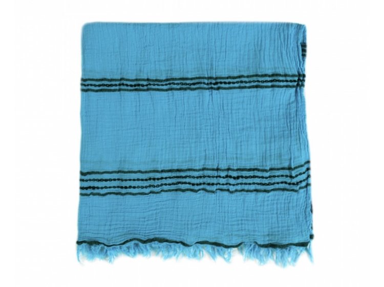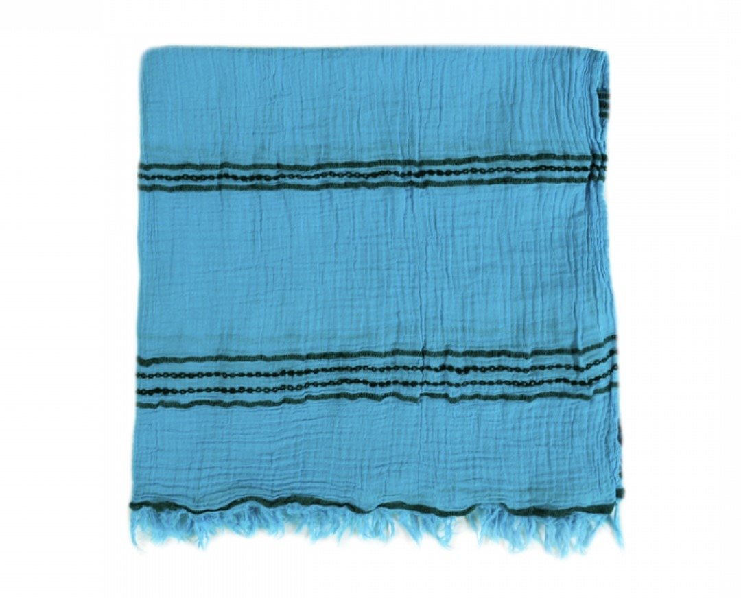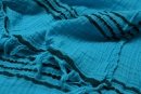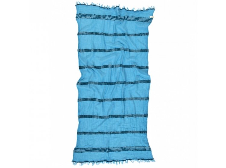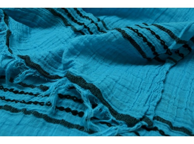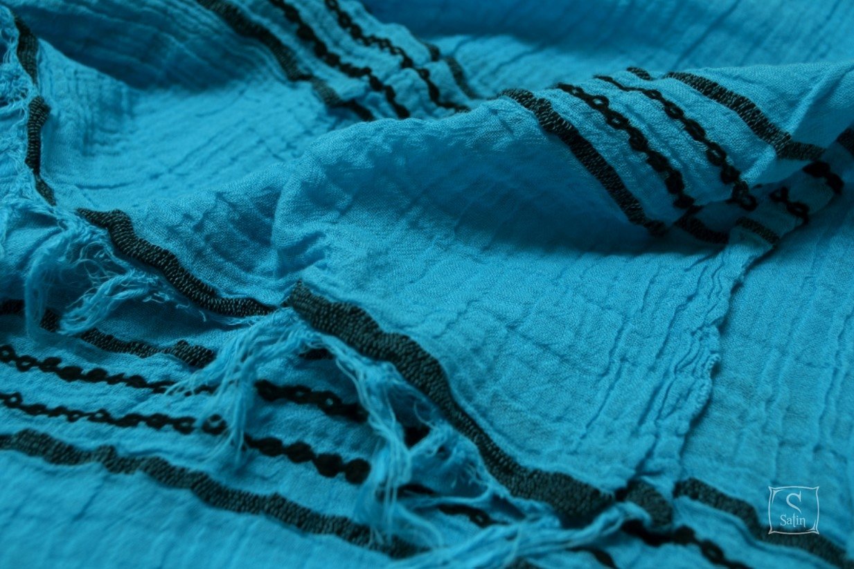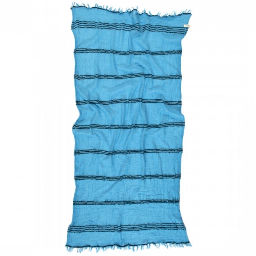 Дуже стильний пляжний рушник Buldans Pareo koyu turkuaz бірюзового кольору з сучасним візерунком смужка, декорований бахромою. Такий рушник можна використовувати як рушник після водних процедур, як пештемаль або парео .