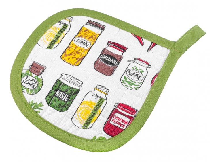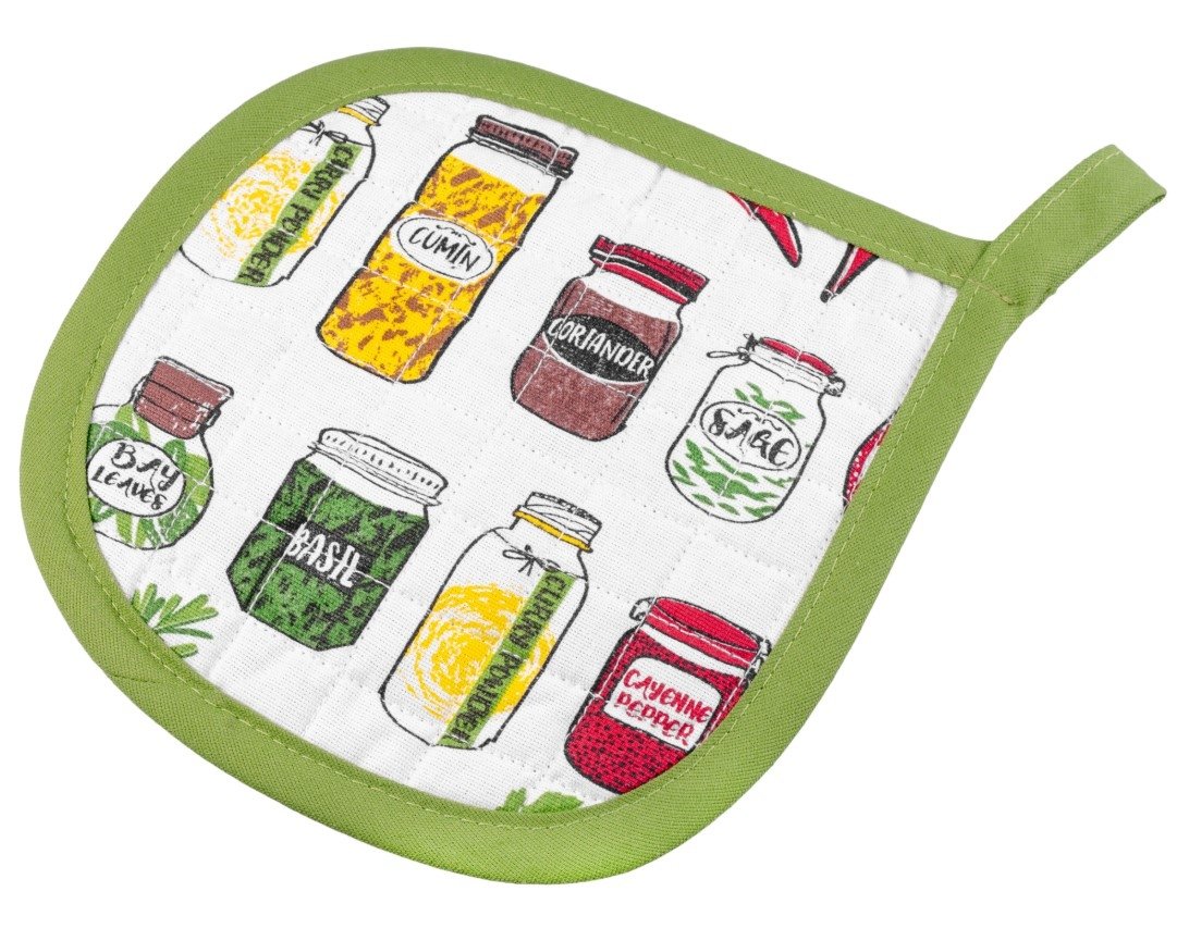 Прихватка Home Line Спеції виконана у різнокольорово-салатових тонах із візерунком кухонної тематики. Стане вірним помічником та стильним аксесуаром на кухні.