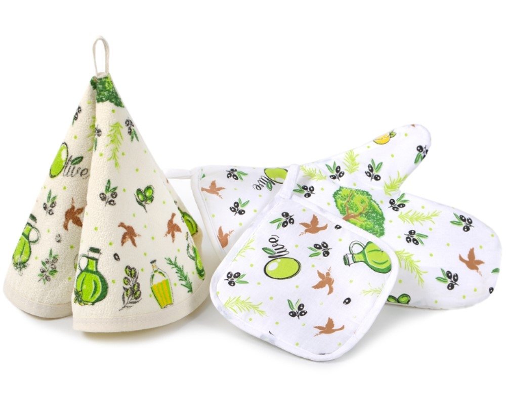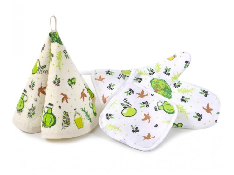 Дуже милий і стильний кухонний набір Olive бездоганної турецької якості від ТМ Lotus включає: махровий рушник 50*50 см з петелькою по центру, прихватку 13*13 см і прихватку-рукавицю 18*28 см , декоровані милий принт.