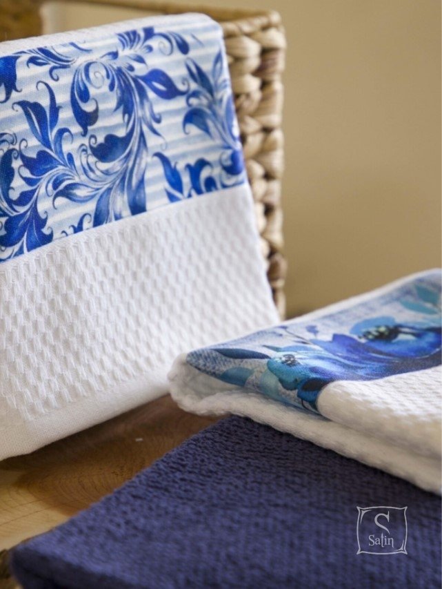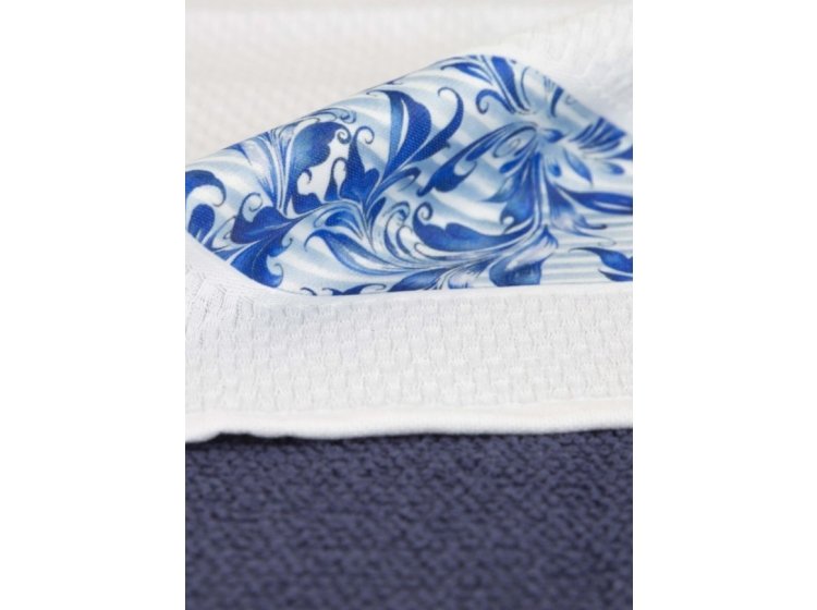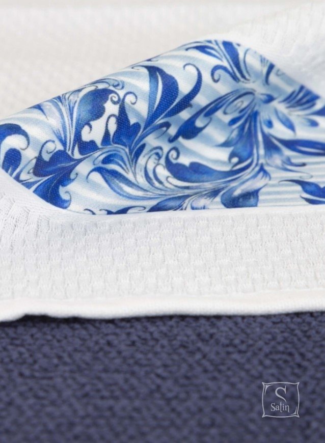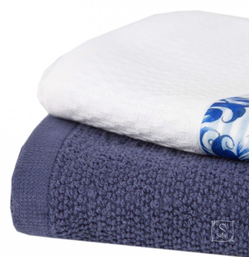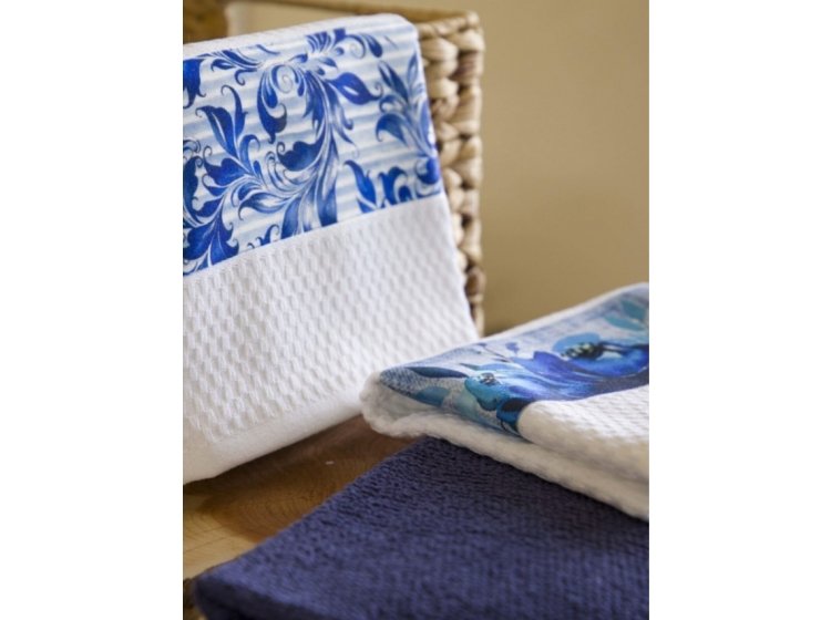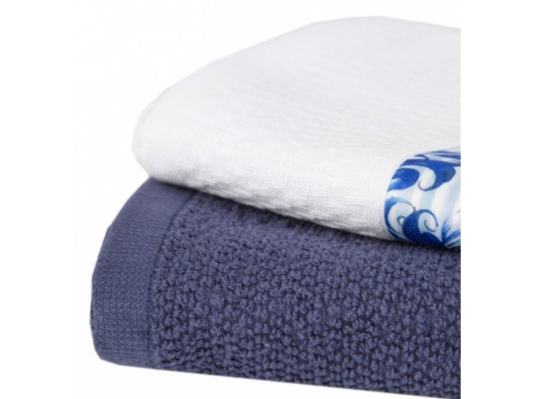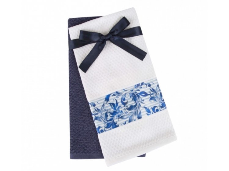 Набір кухонних рушників Cora від турецької торгової марки Home And More складається з двох рушників двох моделей: білого кольору з принтом на бордюрі та однотонного синього, які чудово доповнюють один одного у кольоровій гамі.