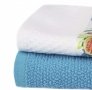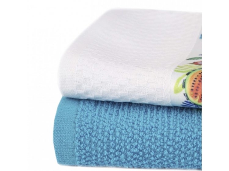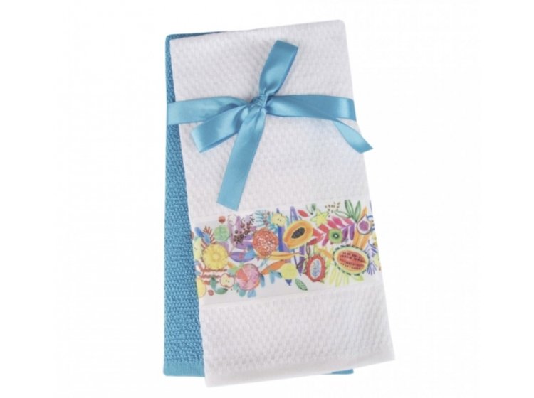 Набір кухонних рушників Regia від турецької торгової марки Home And More складається з рушників двох моделей: білого кольору з барвистим принтом на бордюрі та блакитного однотонного кольору, які відмінно доповнюють один одного в кольоровій гамі.