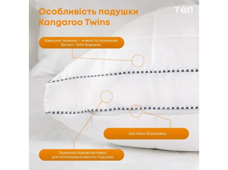 Нова розробка технологів компанії Balakkom: комфортна подушка ТЕП Kangaroo Twins із регулюванням висоти. Зовнішній вистібаний чохол подушки застібається на застібку-блискавку.