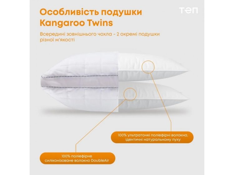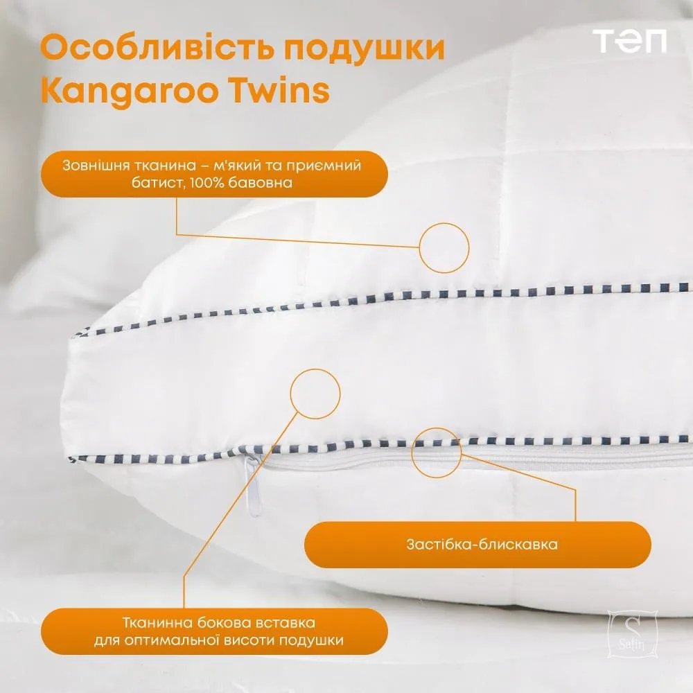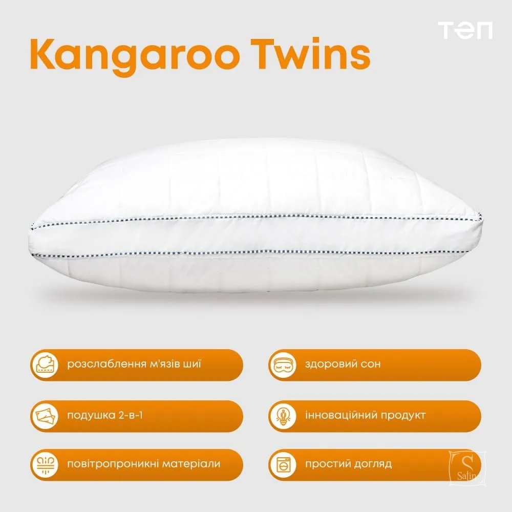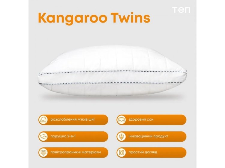 Ця подушка дозволяє м'язам шиї розслабитися, а антиалергенний наповнювач, що «дихає», забезпечує оптимальний мікроклімат у ліжку. Подушки KANGAROO TWINS сприяють швидкому розслабленню та комфортному положенню голови, що забезпечують здоровий сон та, як наслідок, продуктивний день.