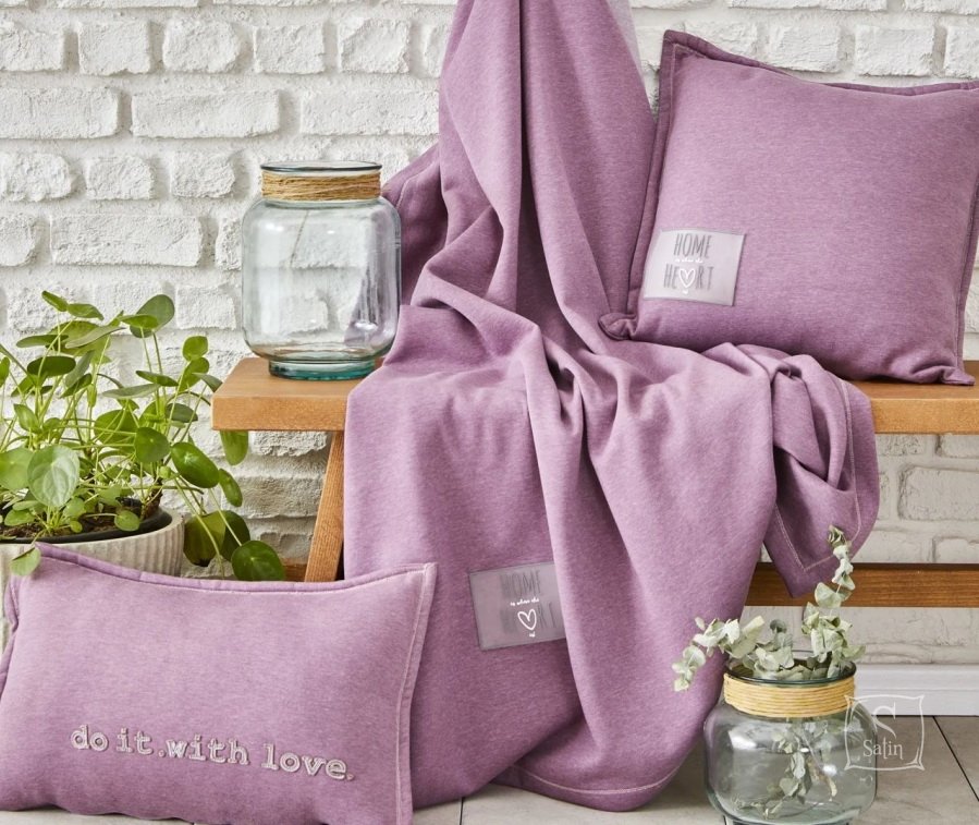 Плед бавовняний Karaca Home Softy Comfort lila однотонний, прикрашений аплікацією з написом. Плед надзвичайно комфортний та призначений спеціально для літнього сезону.