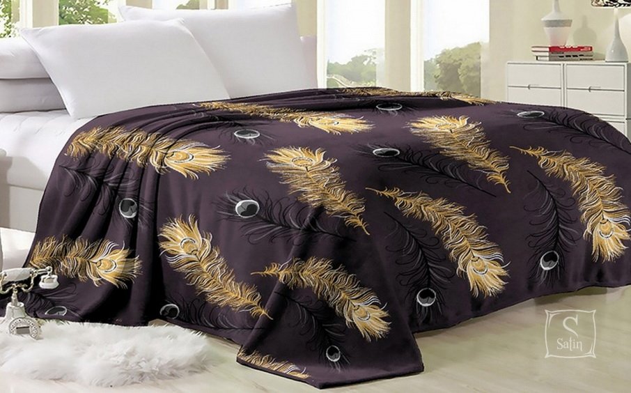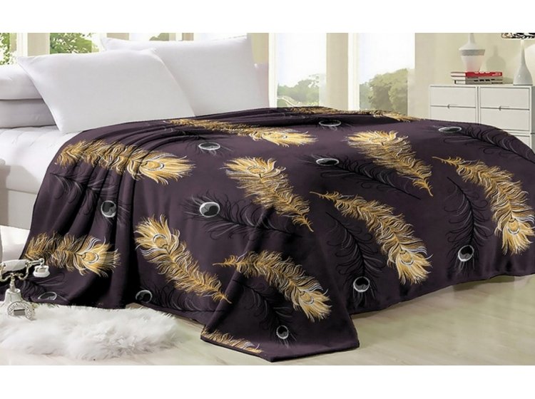 Плед Sofia Перо Павич коричневого кольору з візерунком пір'я із штучного фактурного матеріалу Wellsoft високої щільності (320 г/м2). Затишний, приємний у використанні дуже симпатичний. Має фактуру велюру, надзвичайно м'який і приємний на дотик, досить щільний і злегка пухнастий. Незважаючи на щільність, ця тканина є дуже легкою, добре зберігає тепло і стійкою до численних прань і зносу.