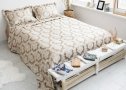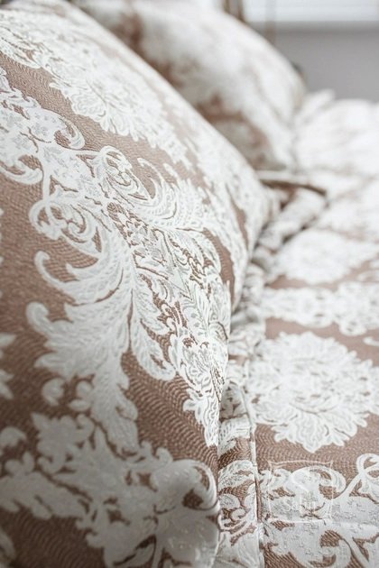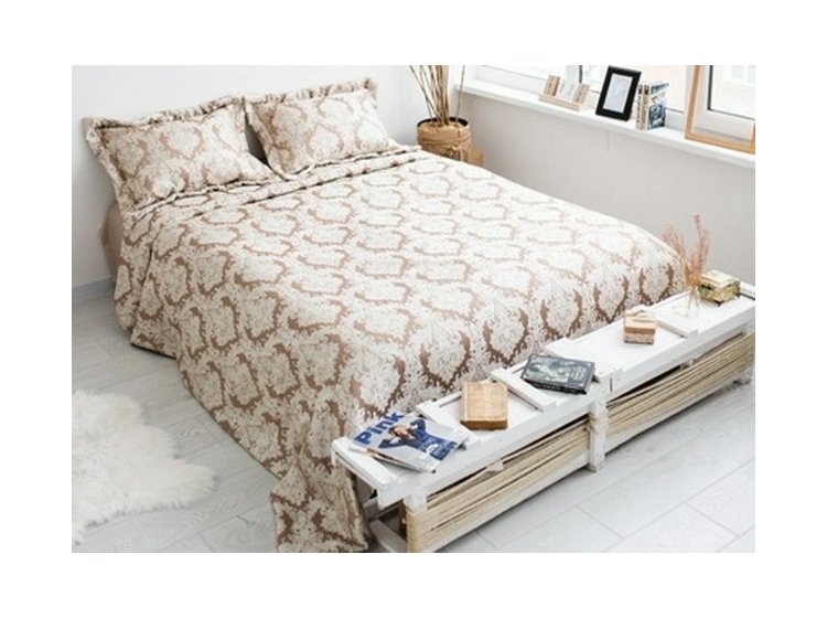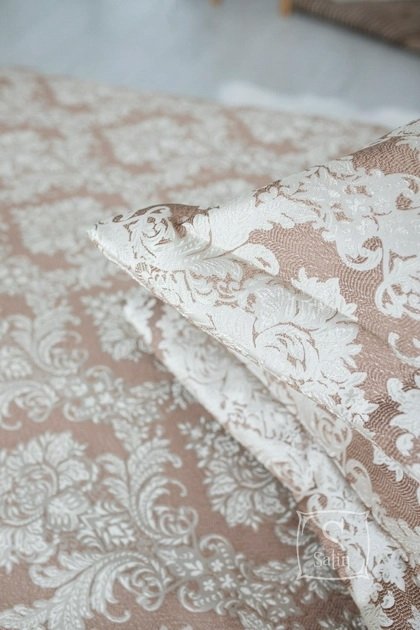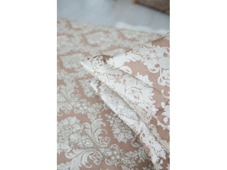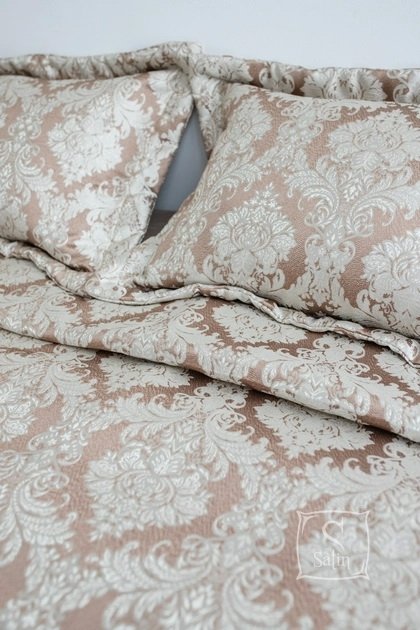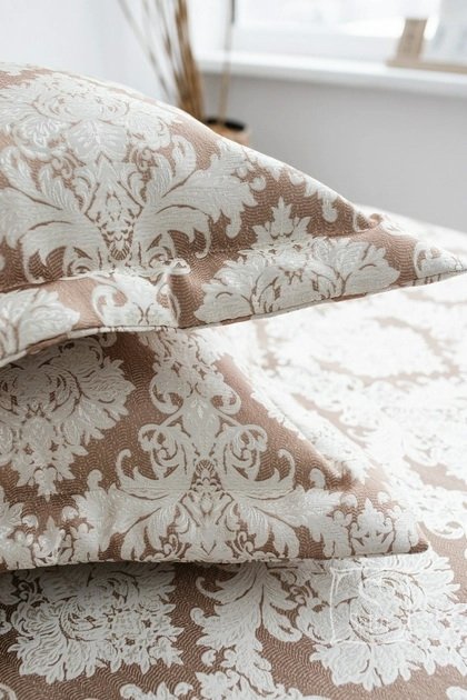Покривало Arya з наволочками виконані в кремово-бежевому кольорі з вензелями з високоякісного 100% поліестеру , який на вигляд і на дотик не відрізняється від бавовни, перетворять спальню без істотних витрат. Тканини з поліестеру легкі, міцні та зносостійкі. Покривало відмінно гармоніюватиме з інтер'єром вашої кімнати, прослужать довго і будуть такими ж міцними і красивими, як у день покупки.