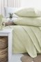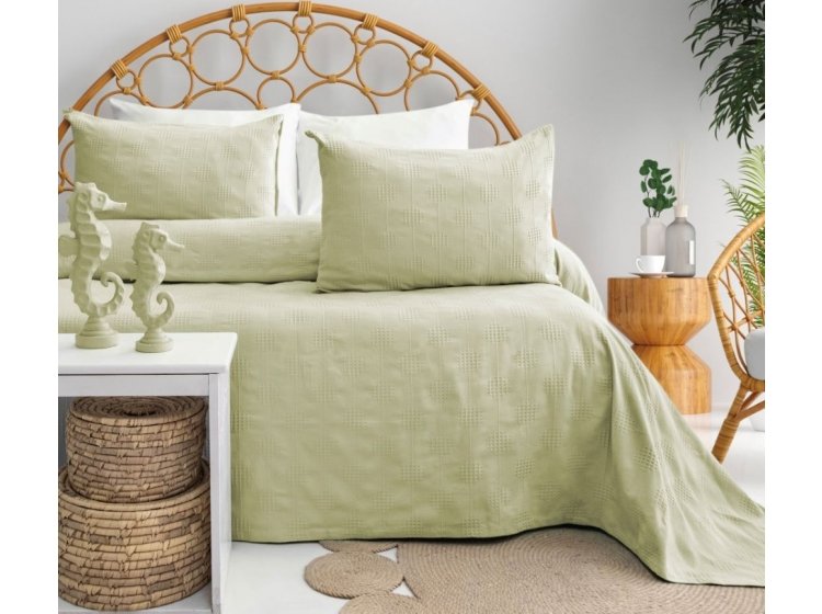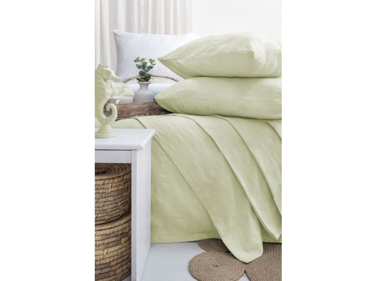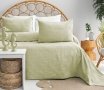Жакардове покривало з наволочками Saheser Zeta green зі 100% бамбука зеленого кольору з візерунком геометрія.