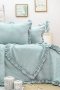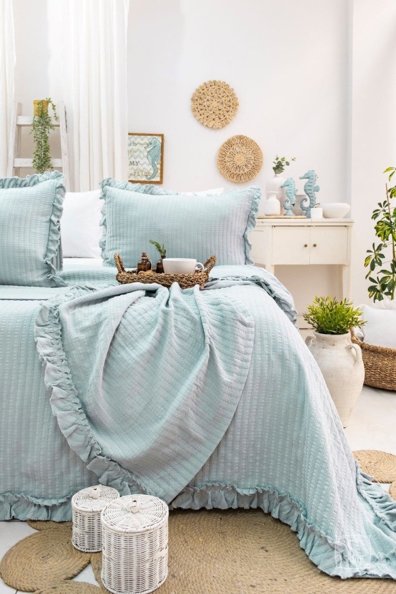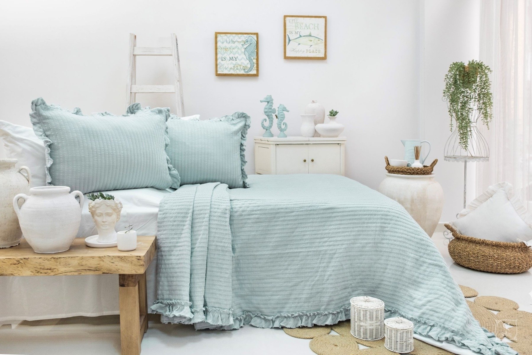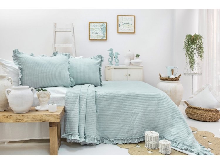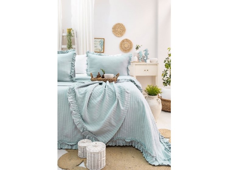 Жакардове покривало з наволочками Saheser Marta mint зі 100% бавовни в ментоловому кольорі, з візерунком смужка.