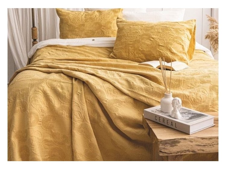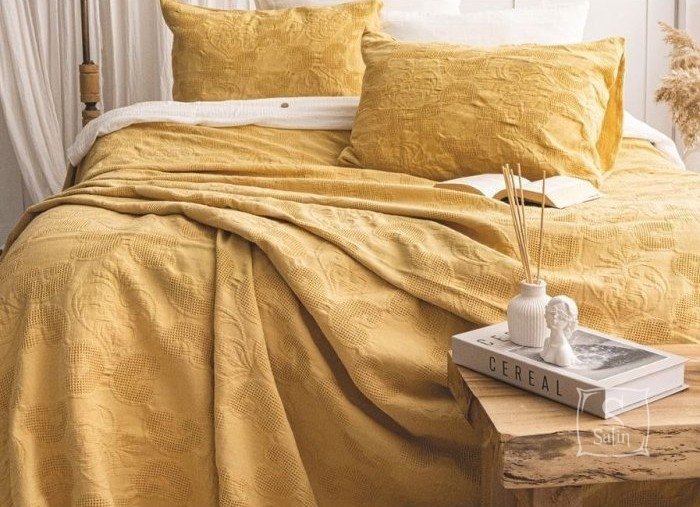 Жакардове покривало з наволочками Saheser Italo sari зі 100% бавовни в тонах гірчичних, з візерунком абстракція.