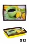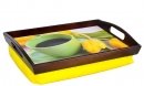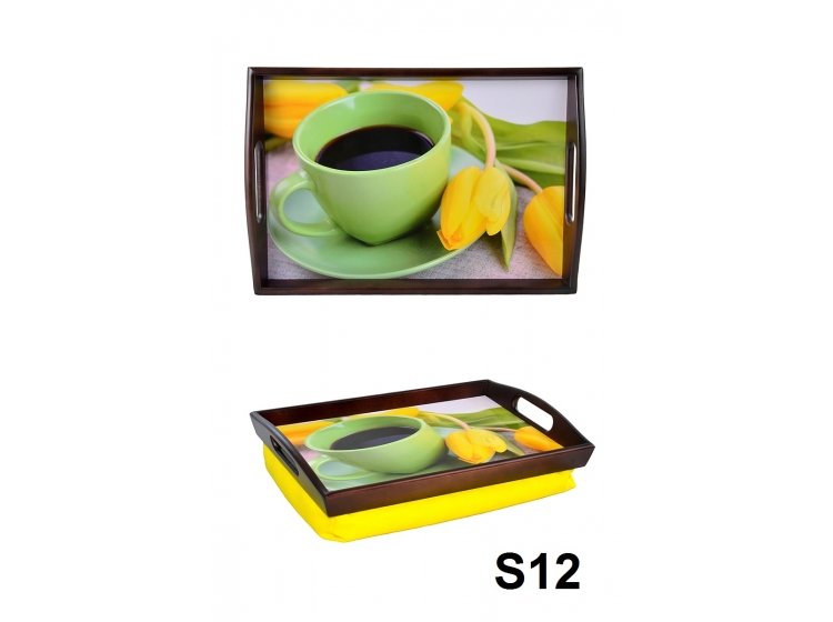 Дуже дорого виглядають підноси на подушці з малюнком на щільному глянцевому папері , нанесеним на меблеве ДВП, з ламінацією . Рамка підносу- вільха . Зовнішня поверхня лакована та яскрава вологостійка та термостійка. Такі таці будуть відмінним подарунком і потрібною функціональною річчю до будинку