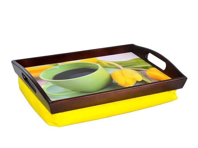 Піднос на подушці з ручками відмінно стоїть на будь-якій нерівній поверхні, набуваючи її форми за рахунок наповнення низу підносу полістироловими кульками.