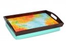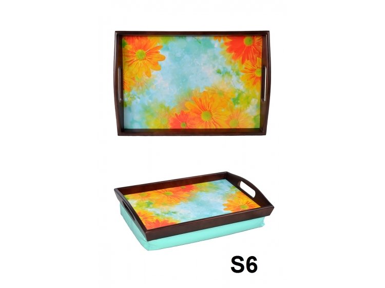 Дуже дорого виглядають підноси на подушці з малюнком на щільному глянцевому папері , нанесеним на меблеве ДВП, з ламінацією . Рамка підносу- вільха . Зовнішня поверхня лакована та яскрава вологостійка та термостійка. Такі таці будуть відмінним подарунком і потрібною функціональною річчю до будинку