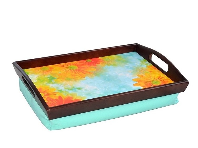 Піднос на подушці з ручками відмінно стоїть на будь-якій нерівній поверхні, набуваючи її форми за рахунок наповнення низу підносу полістироловими кульками.