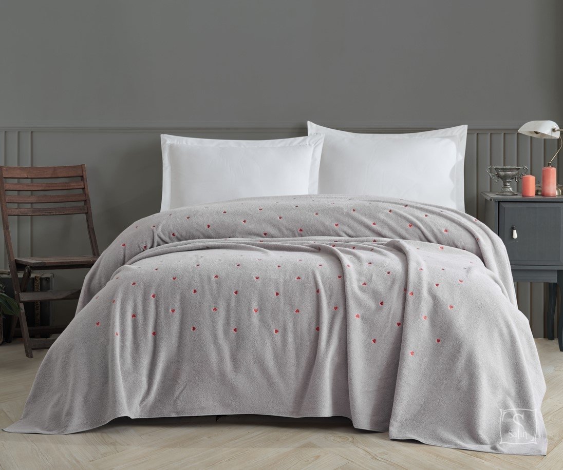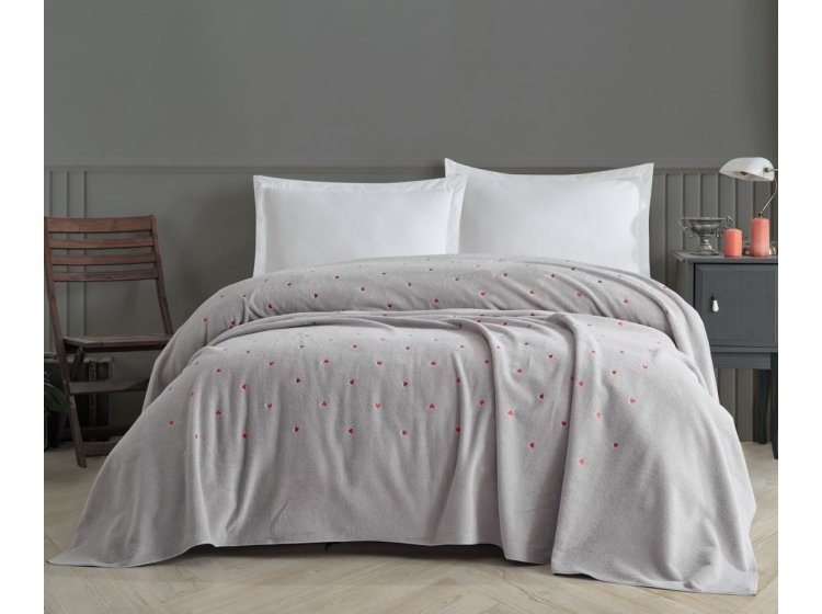 • Покривало-простирадло махрове Hobby Lubow/Love Microcotton виконане у світло-сірому кольорі з красивим вишитым візерунком у вигляді сердець;