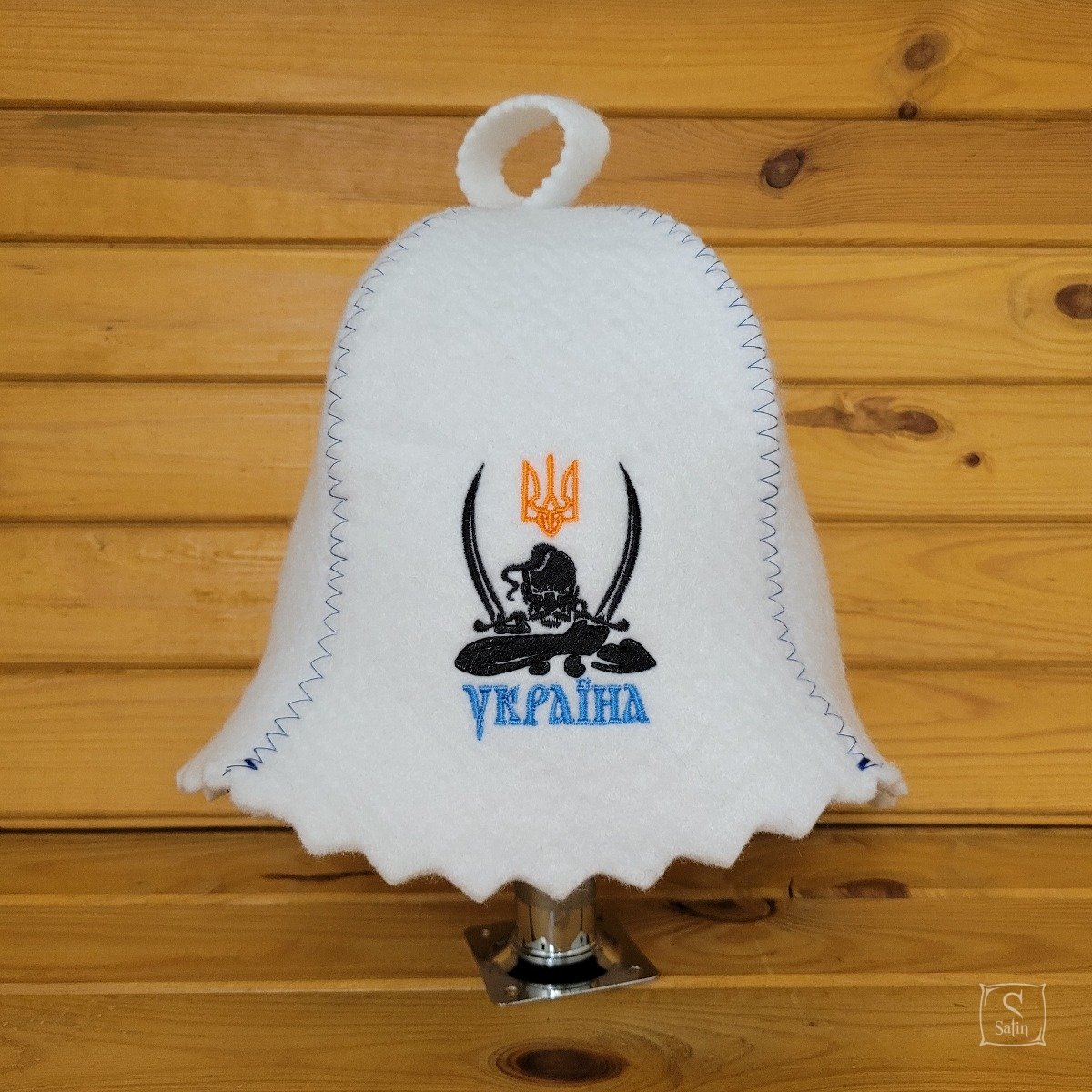 Шапка для сауни виготовлена з термопресованої повсті у вигляді дзвіночка з вишивкою Козак, білого кольору - чудовий подарунок коханим і друзям і незамінна річ для відвідування сауни. Оздоблена машинною вишивкою. Має відмінні термоізоляційні властивості. Приємна на дотик, зручна у використанні. Вся продукція має гігієнічні сертифікати ДСЕС.
