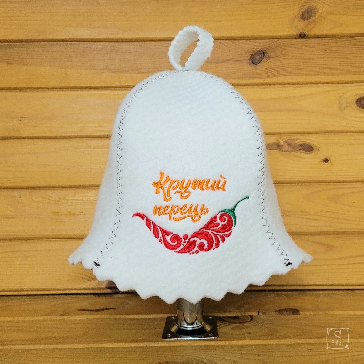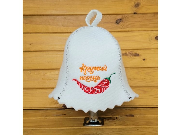Шапка для сауни виготовлена з термопресованої повсті у вигляді дзвіночка з вишивкою Крутий перець, білого кольору - чудовий подарунок коханим та друзям та незамінна річ для відвідування сауни. Оздоблена машинною вишивкою. Має відмінні термоізоляційні властивості. Приємна на дотик, зручна у використанні. Вся продукція має гігієнічні сертифікати ДСЕС.