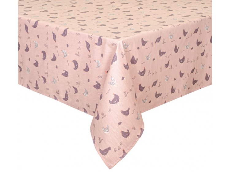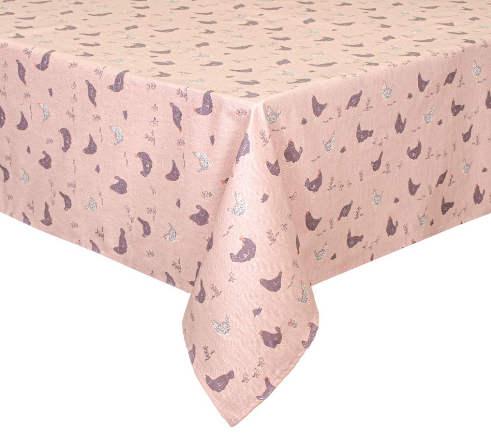 • Скатертина Home Line Прогулянка з курчатами виготовлена з напівпанами (100% бавовни) , в рожевому кольорі з малюнком курочки і курчата .