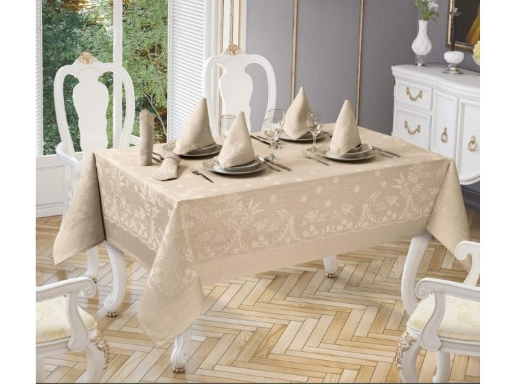 Ошатна турецька скатертина Jackline Pano Linen Cappucino 9886-7 бежевого кольору виконана зі 100% поліестеру, чудово підходить як для домашнього, так і для святкового використання, створить у вашому будинку атмосферу затишку та комфорту.