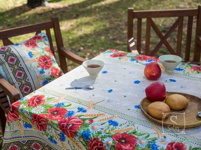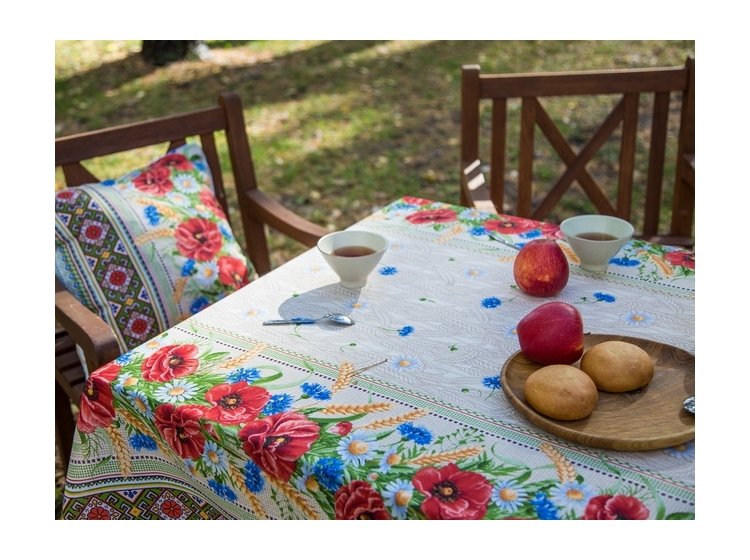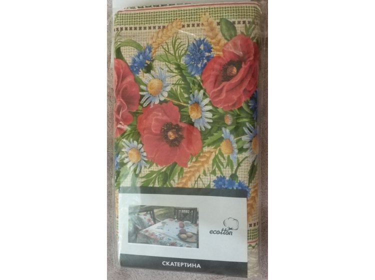 Ошатна новорічна скатертина Novita 18752/1 Колоски виготовлена з щільної 100% бавовняної тканини полотняне плетіння, нитки щільні типу "рогожка", з візерунком у приємних тонах. Щільність : 190 г./кв.м. Такий виріб добре виглядає як на святковому столі, так і при щоденному використанні. Скатертина добре стирається, легка у догляді. Упаковка від виробника.