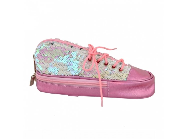 Пенал YES. TP-24 Sneakers with sequins rainbow оригінальний у формі кеда складається з двох містких відділень, застібаються на блискавку, куди дитина зможе складати ручки, фломастери, гумки та інше канцелярське приладдя, необхідне для шкільних занять. Пенал виконаний у сіро-рожевому кольорі з незвичайним дизайнерським декором двосторонні двокольорові паєтки, перлматрова шкіра еко, металева фурнітура. .